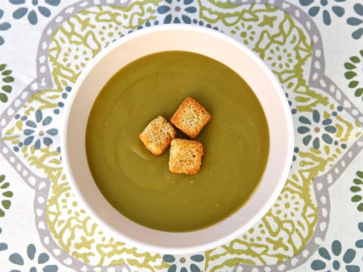 Strain the peas through a food mill or a fine mesh sieve, if desired. I prefer texture to my soup so I leave out this step.