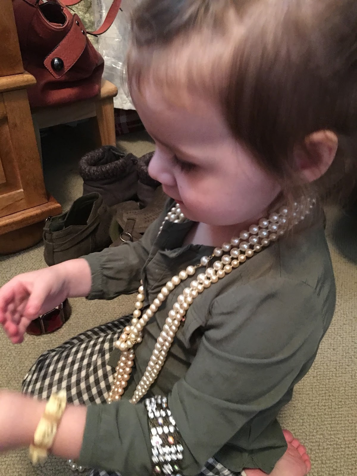 Once Kendall tires of the button jar (and it keeps her entertained for a least 30 min.) she moves on to the jewelry box. Smart girl.